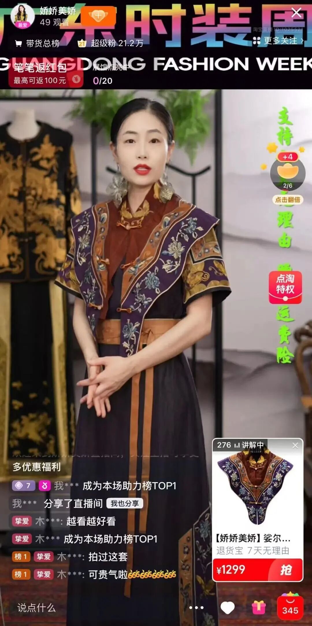 同期,结合当前的直播、短视频等新模式,涵兮、希琳等品牌在视频号、抖音、淘宝等平台上,开展香云纱产品带货,将创意转化为商业,让更多消费者以更直接的方式购买香云纱时尚产品,推动香云纱的市场价值转化。